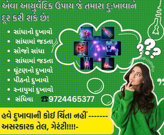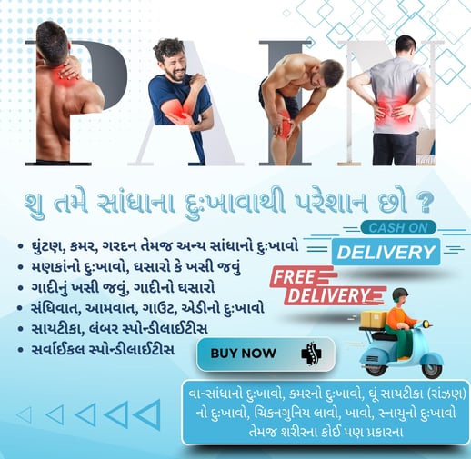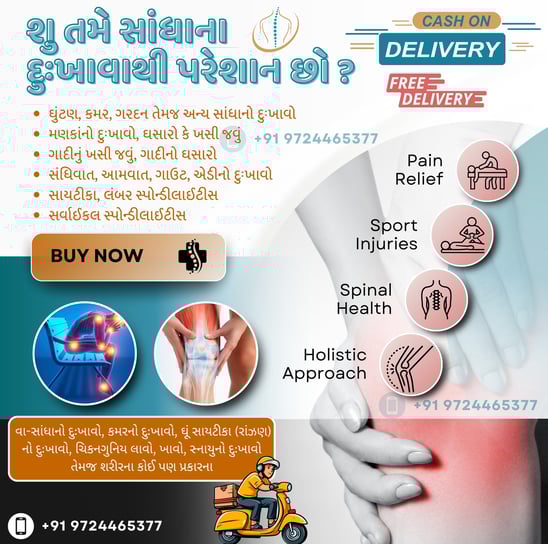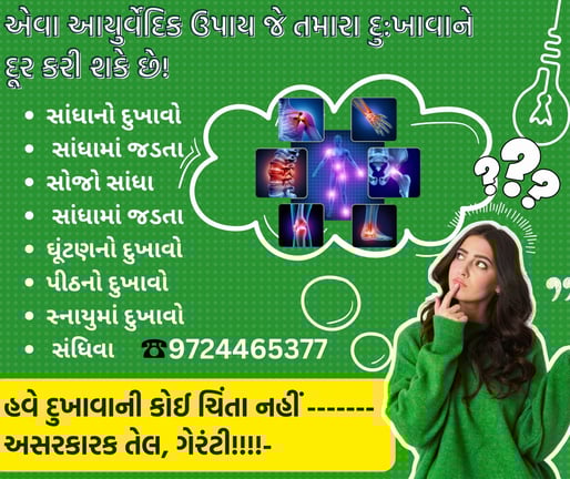 વા-સાંધાનો દુઃખાવો, કમરનો દુઃખાવો, ઘૂં સાયટીકા (રાંઝણ) નો દુઃખાવો, ચિકનગુનિય લાવો, ખાવો, સ્નાયુનો દુઃખાવો તેમજ શરીરના કોઈ પણ પ્રકારના દુઃખાવામાં 100% મળે છે. દુઃખાવા માં 100% રિઝલ્ટ મળે છે.